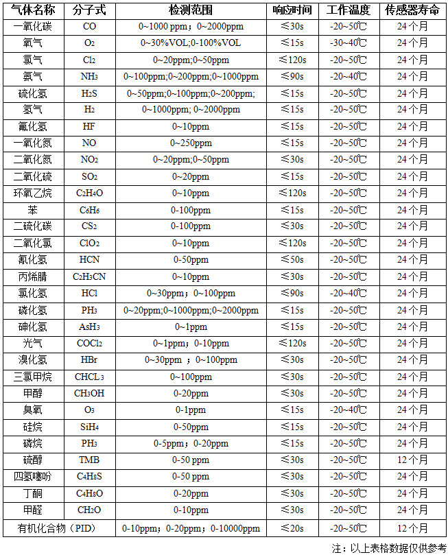 响应时间T90:对应不同气体传感器