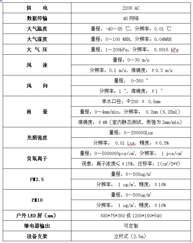 ●监测因子:大气温度、湿度、气压、雨量、风速、风向、光照强度、负氧离子、